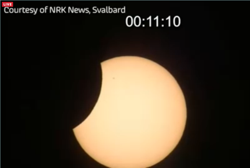 Ακολουθούν φωτογραφίες από τηλεσκόπιο που έχει στηθεί στο απομονωμένο αρχιπέλαγος Σβάλμπαρντ στην Αρκτική και το οποίο παρακολουθεί την έκλειψη μέσα από ειδικά φίλτρα.